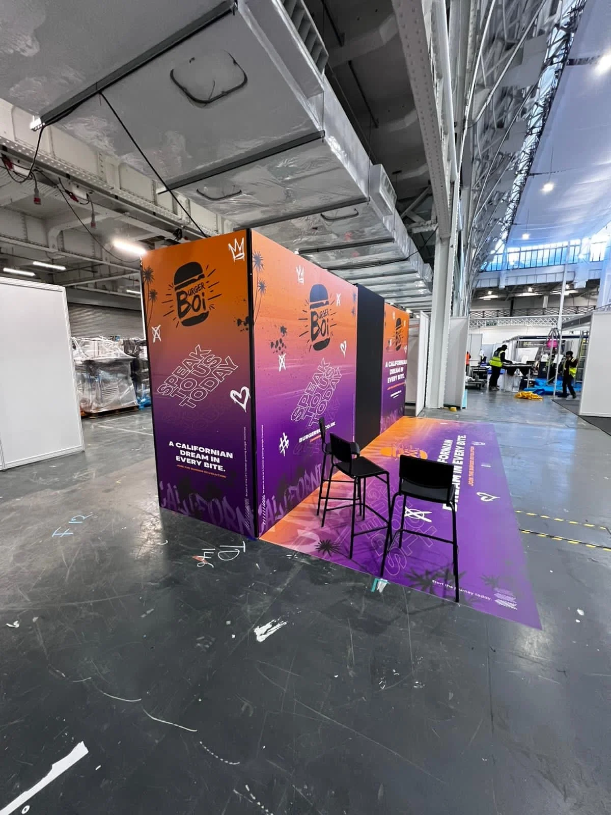 Exhibition stand full setup including, print, screens, stage setup and flooring.